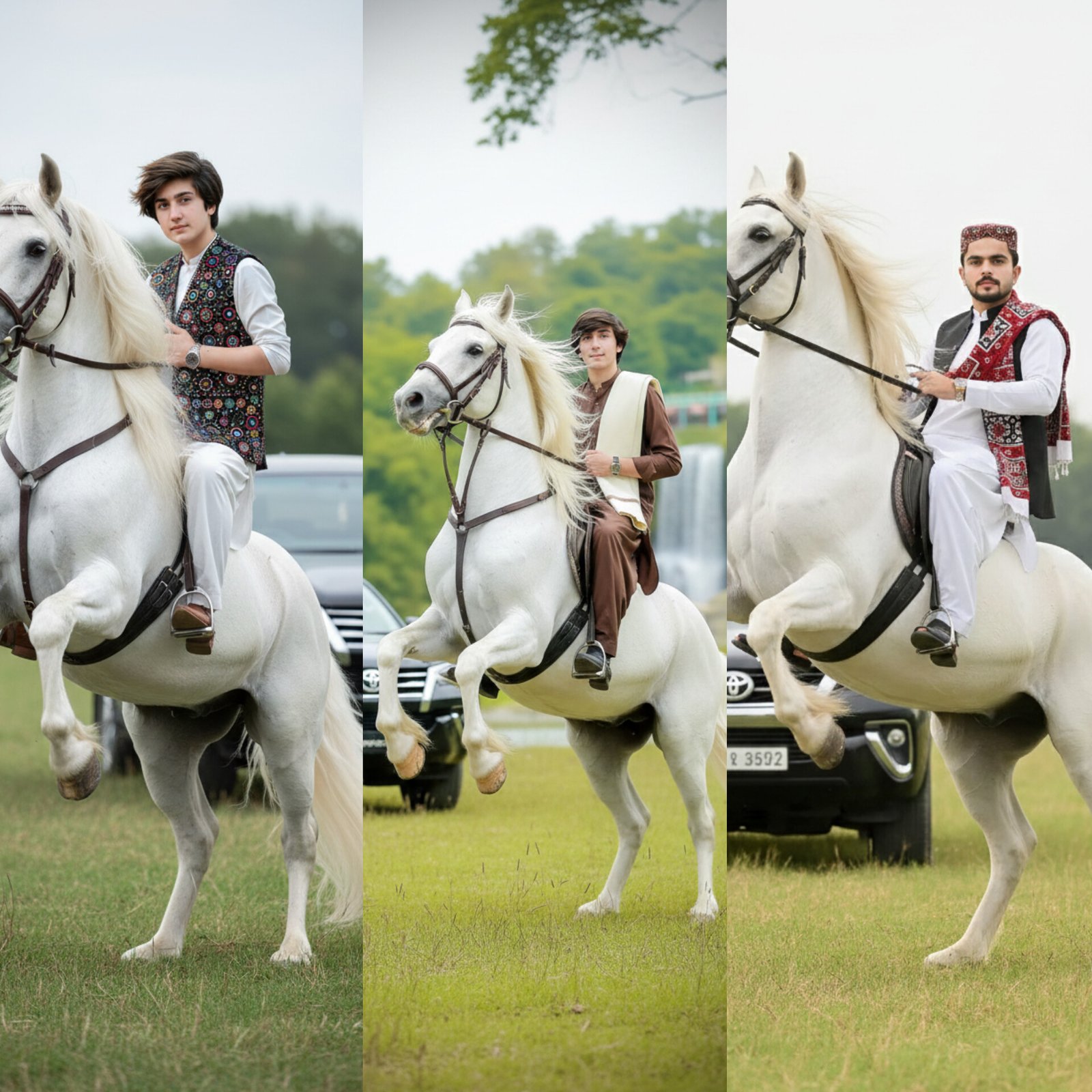 “A 29 Year Man Sitting On majestic white horse, possibly a Gypsy Vanner or Friesian, with a very long, flowing white mane and tail, rears up on its hind legs in a grassy field. It has a bridle with dark leather straps and brass hardware. The horse’s powerful build and feathered hooves are prominent. The Man Is Wearing Outfit as a Uploaded photo.In The Background Of Horse Stand a Balck Fortuner.The background features blurred green foliage and hints of trees under a slightly overcast or bright sky, giving a natural, slightly ethereal Don’t Change The Face 100 Percent Reserved.