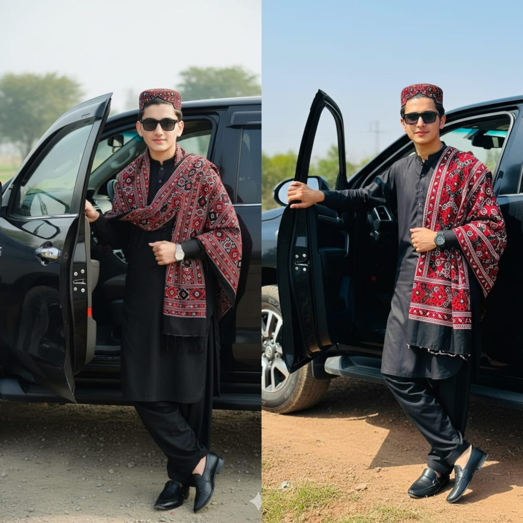 From the timeless black shalwar kameez to the richly patterned Sindhi Ajrak, every element tells a story — a story of roots, respect, and refined taste.